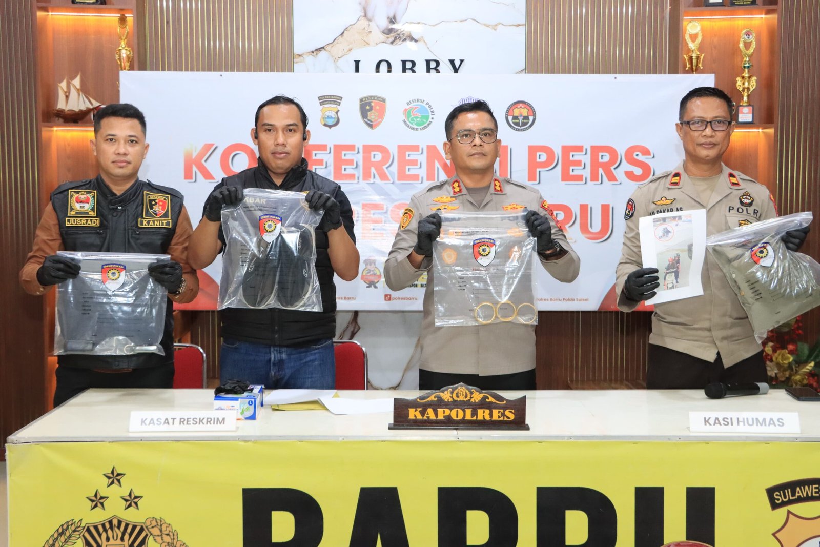 JF diamankan di Jeneponto pada Jumat, 20 Februari 2026, setelah pengejaran tim gabungan Polres Barru dan Polda Sulawesi Selatan. Barang bukti yang disita antara lain 3 gelang emas, 1 unit sepeda motor, dan 1 unit handphone.